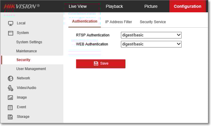 - Configure camera Security, navigate to Configuration > System > Security > Authentication