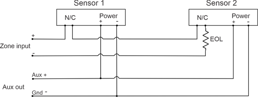 For multiple powered sensors on the same zone, the sensors should be wired to the zone as shown in Figures 6 and 7, based on sensors being N/O or N/C. The EOL resistor should be placed at the sensor furthest away from the panel. The power wiring should be run to one sensor and then a second run of wiring should go from the first sensor to the second. Alternatively, the power wiring could go directly from each sensor back to the panel; this requires longer cable runs.