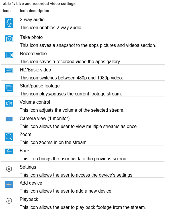 The below icon guide helps navigate and configure settings in the ClareVision Plus app.