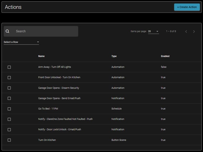 Actions are Automations, Schedules, and Notifications created in the ClareHome application by the users. Those actions are also accessible and manageable in FusionPro on behalf of the ClareOne User.