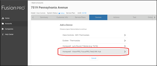 - Select the device type, Honeywell – VisionPRO, FocusPRO, RedLINK Hub.