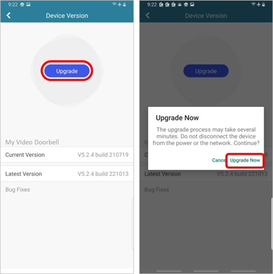 - Tap Upgrade to initiate the upgrade process. A warning will appear. Do not disconnect the device from power or the network. Tap Upgrade Now to continue.